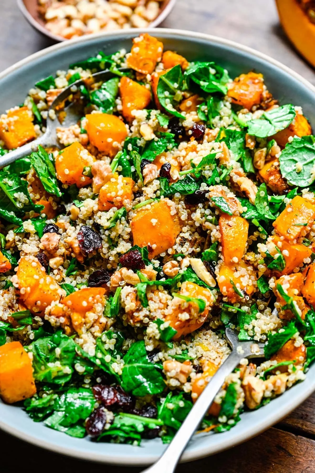 Assemble the Bowl: Add quinoa and greens to a bowl, top with roasted pumpkin, drizzle with dressing, and sprinkle pumpkin seeds on top.
