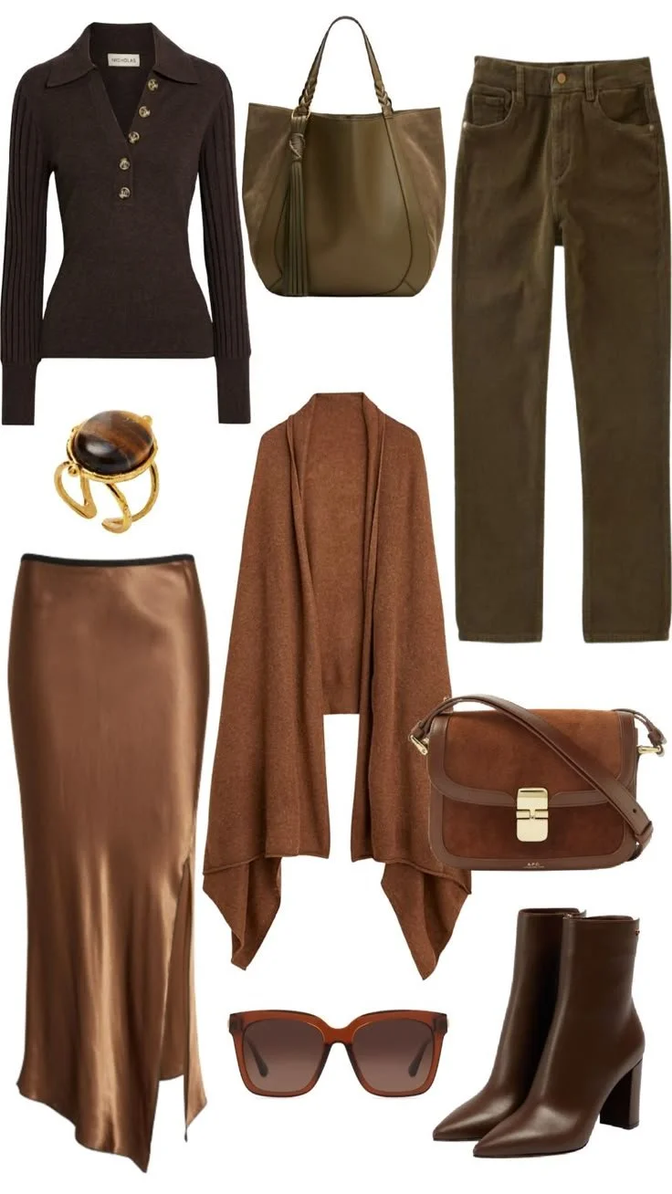 Rich, chocolatey tones and soft camel shades are the new neutrals of fall. From oversized trench coats to suede boots, brown offers effortless sophistication — grounding any outfit with natural warmth. Whether styled monochromatically or paired with pops of color, earthy browns bring a timeless polish to seasonal wardrobes.